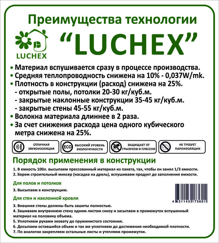 Универсальная эковата "LUCHEX eco" применяется для утеплпения перекрытий, полов, стен, чердаков.