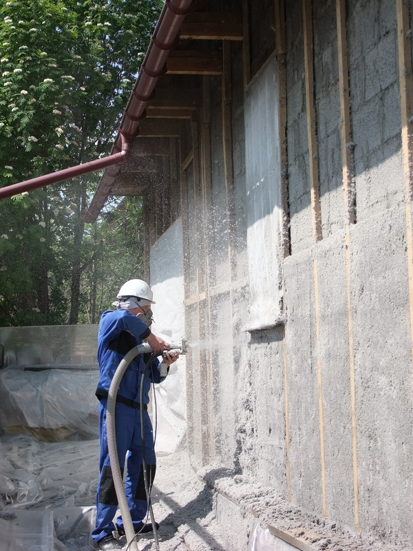 Влажно - клеевой способ выполняется только в летнее время, с применением дополнительного оборудования, требует большого опыта в работе: благодаря смешиванию на лету сухой эковаты (в ее состав входит природный клей - лигнин) с водой, происходит прилипание состава к поверхности и после высыхания образуется мягкий утепляющий и шумоизолирующий слой.